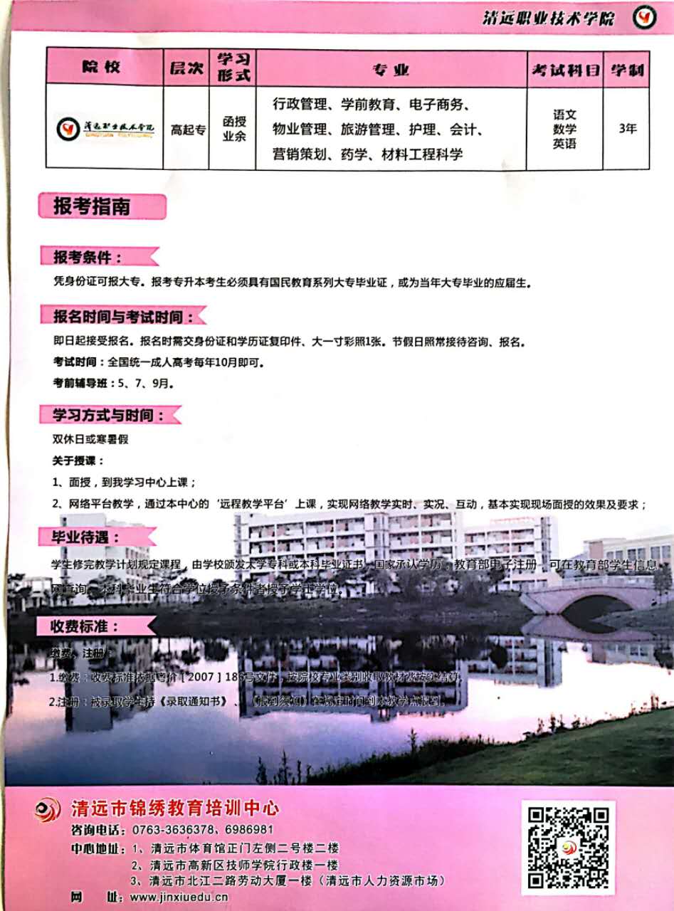 北京大學(xué)、清遠(yuǎn)職業(yè)技術(shù)學(xué)院圓夢計劃正式啟動,三年學(xué)費(fèi)只需5000元,考試前一百名三年學(xué)費(fèi)只需1000元,心動不如行動,趕快加入圓夢計劃吧!咨詢熱線:0763-3630112 報名地址:清遠(yuǎn)市北江二路勞動大廈一樓