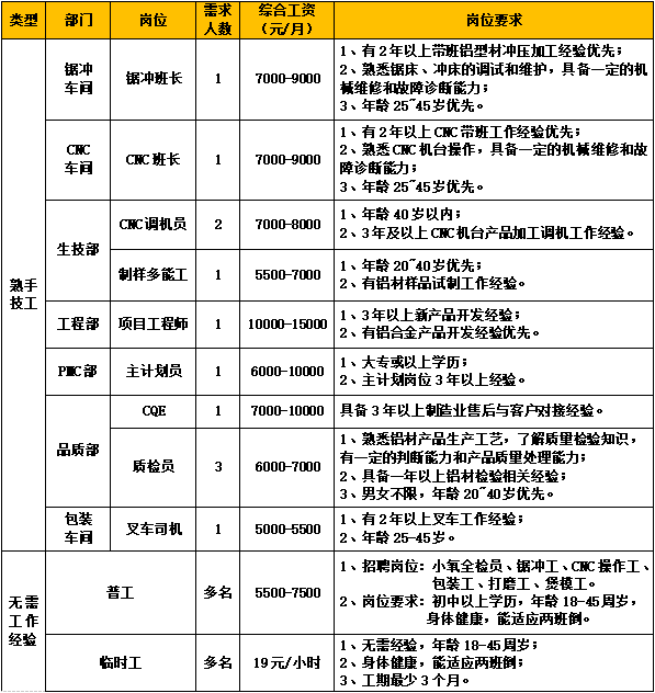 因生產(chǎn)發(fā)展需要,誠(chéng)聘以下崗位: