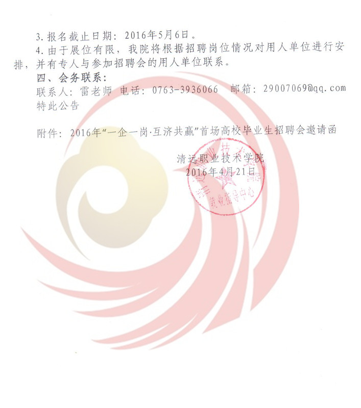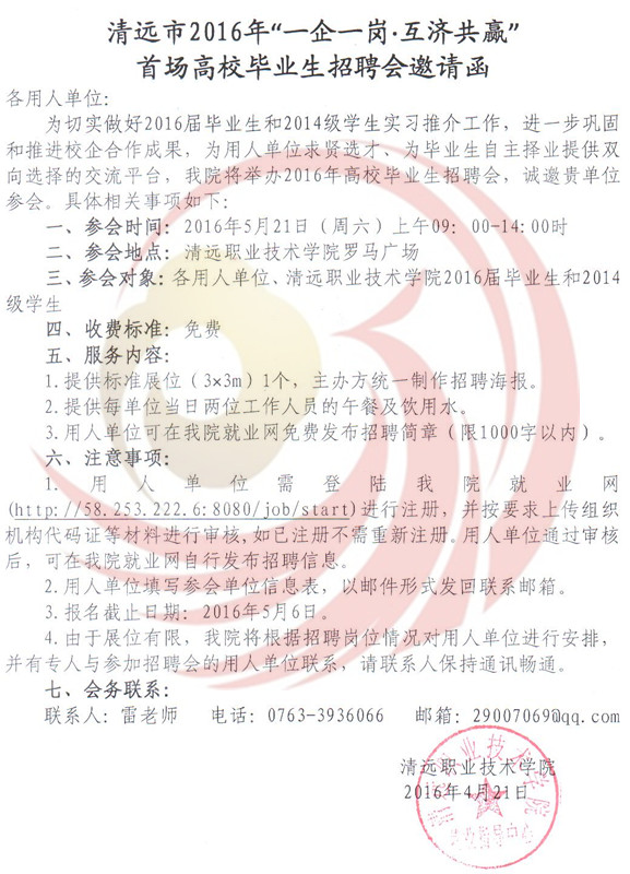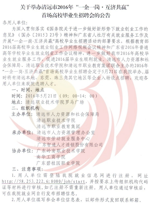 為深入貫徹落實(shí)《國(guó)務(wù)院關(guān)于進(jìn)一步做好新形勢(shì)下就業(yè)創(chuàng)業(yè)工作的意見(jiàn)》(國(guó)辦﹝2015﹞23號(hào))精神和廣東省人社廳有關(guān)就業(yè)服務(wù)工作及開(kāi)展“一企一崗▪互濟(jì)共贏”高校畢業(yè)生找屁活動(dòng)的部署要求,根據(jù)教育部2016屆高校畢業(yè)生就業(yè)創(chuàng)業(yè)工作網(wǎng)絡(luò)視頻會(huì)議精神和廣東省2016年普通高等學(xué)校畢業(yè)生就業(yè)創(chuàng)業(yè)工作會(huì)議精神,進(jìn)一步做好我市2016年高校畢業(yè)生就業(yè)服務(wù)工作,促進(jìn)2016屆畢業(yè)生順利就業(yè)。清遠(yuǎn)市人力資源四川和社會(huì)保障局,清遠(yuǎn)市職業(yè)技術(shù)學(xué)院和清遠(yuǎn)市職業(yè)教育集團(tuán)聯(lián)合主辦的2016年“一企一崗▪互濟(jì)共贏”首場(chǎng)高校畢業(yè)生招聘會(huì)定于5月21日在清遠(yuǎn)市職業(yè)技術(shù)學(xué)院舉辦,屆時(shí)將有清遠(yuǎn)本地、東莞、珠三角其他地區(qū)等企業(yè)入場(chǎng)設(shè)點(diǎn)招聘,歡迎各用人單位到清遠(yuǎn)市職業(yè)技術(shù)學(xué)院選聘人才。