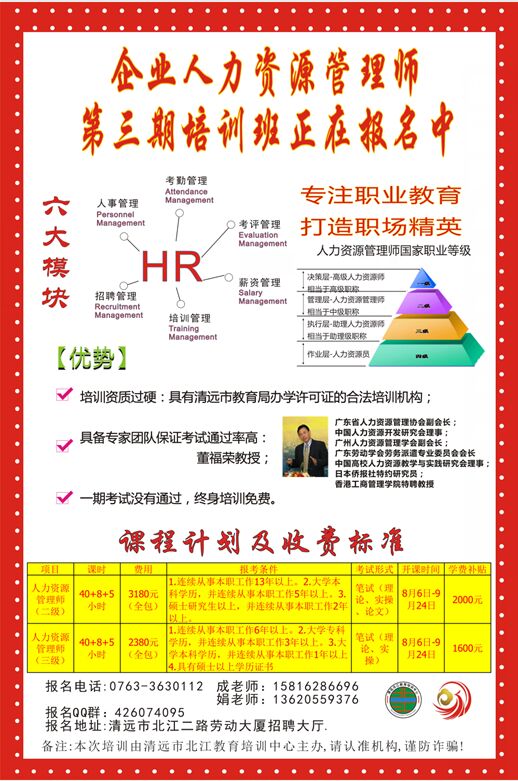 企業(yè)人力資源管理師第三期培訓(xùn)班正式開始報名,歡迎各位有意向了解或者想考的小伙伴到勞動大廈一樓現(xiàn)場咨詢。本次培訓(xùn)由清遠(yuǎn)市北江教育培訓(xùn)中心主辦,請認(rèn)準(zhǔn)機(jī)構(gòu),謹(jǐn)防受騙。